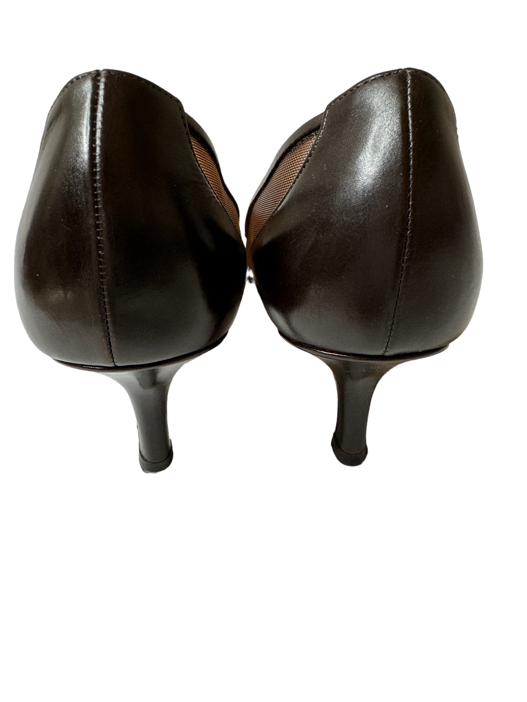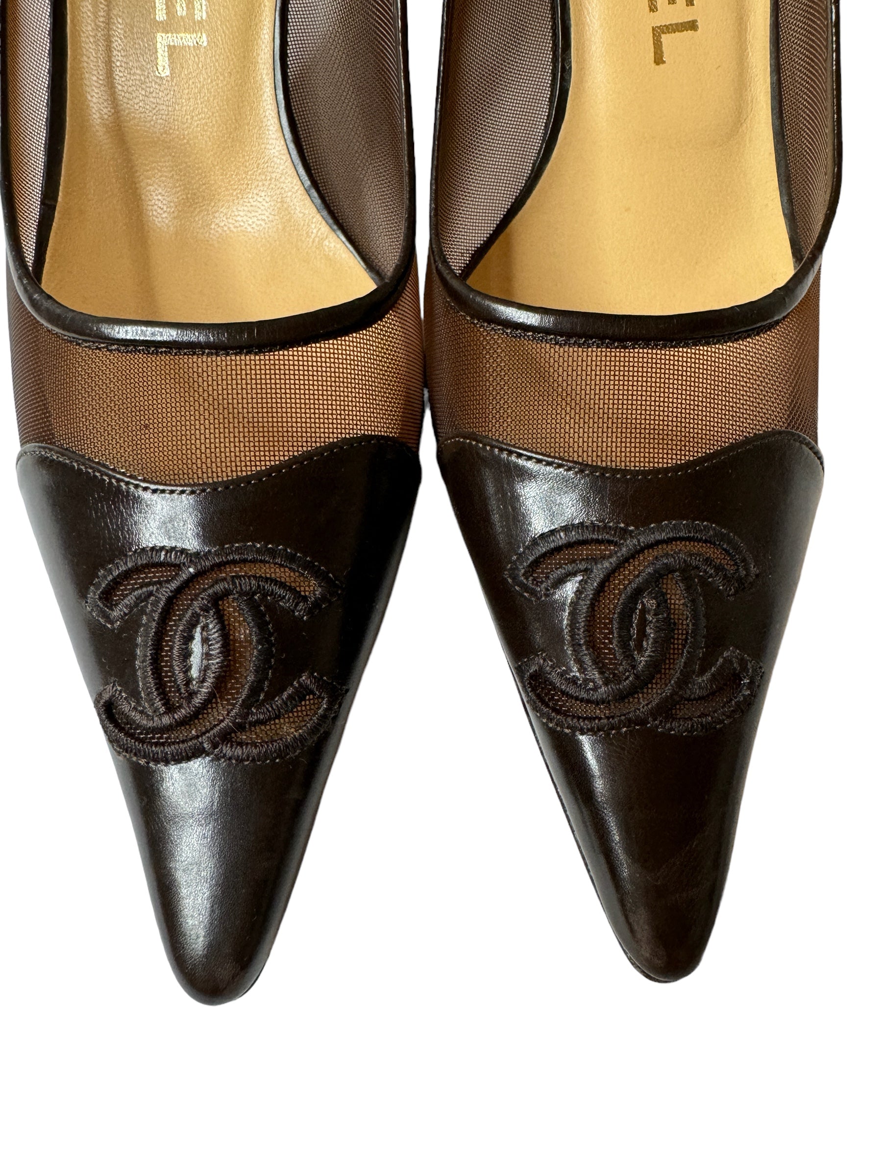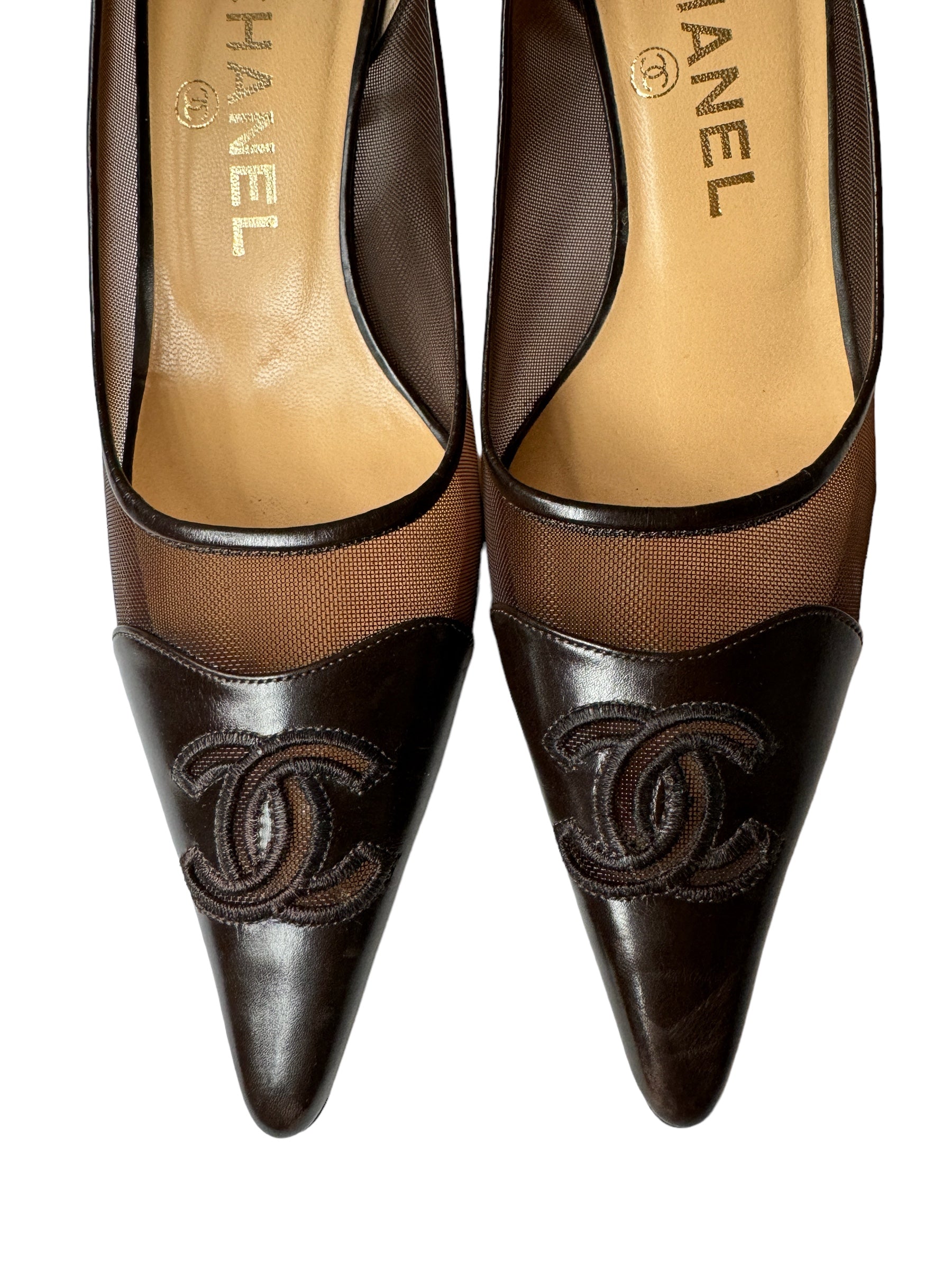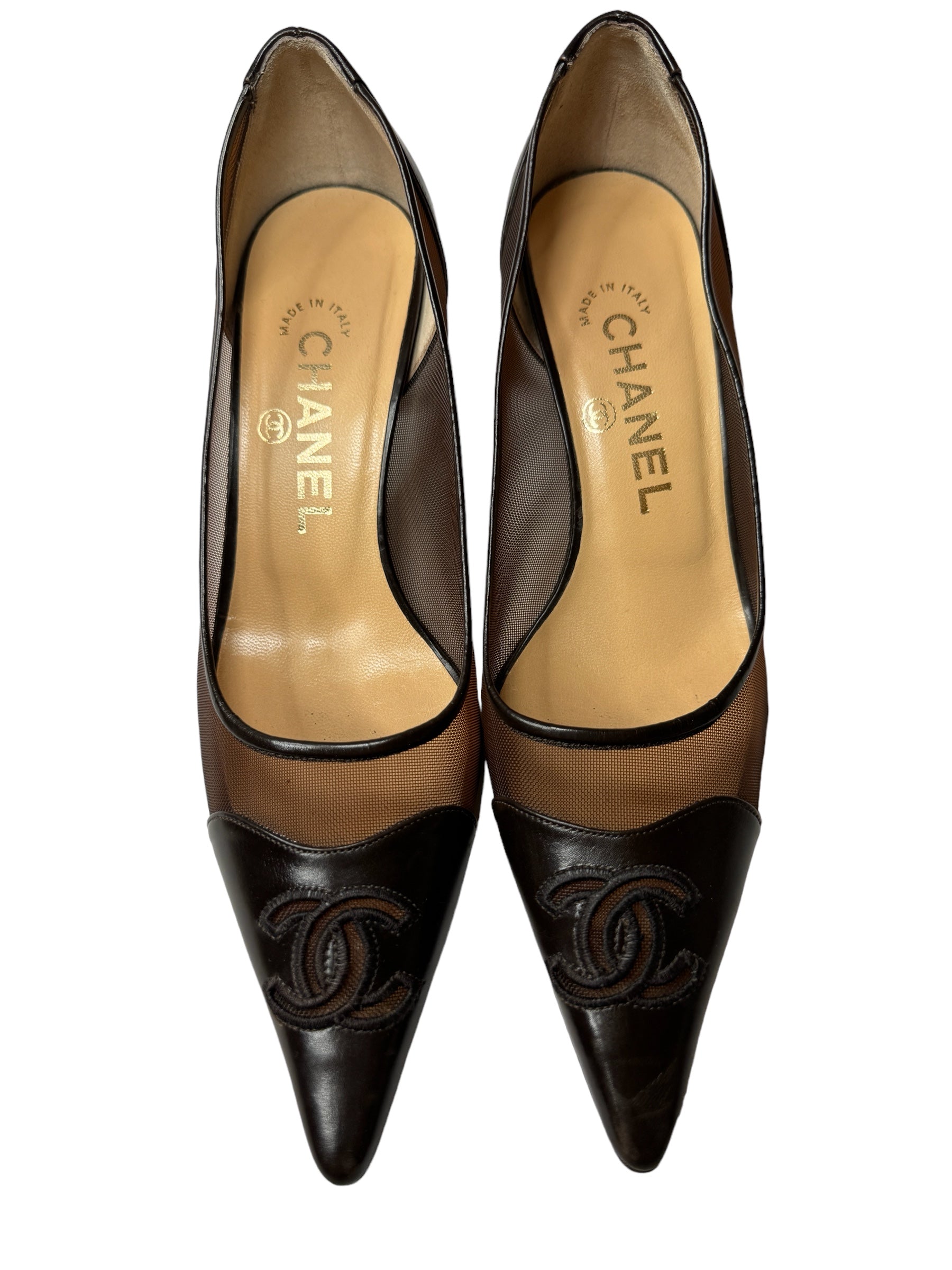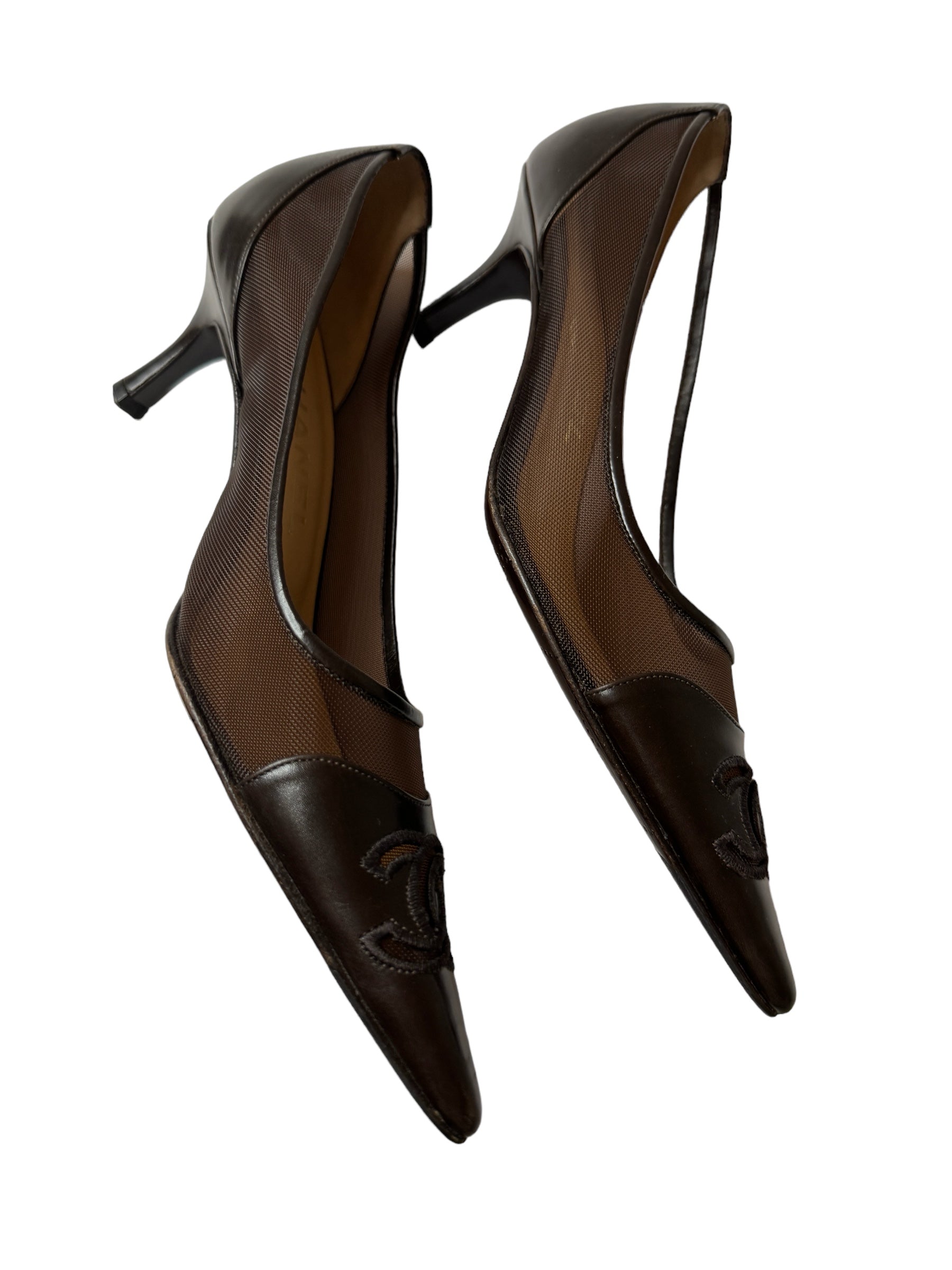 CHANEL DARK BROWN LEATHER AND MESH CC HEELS